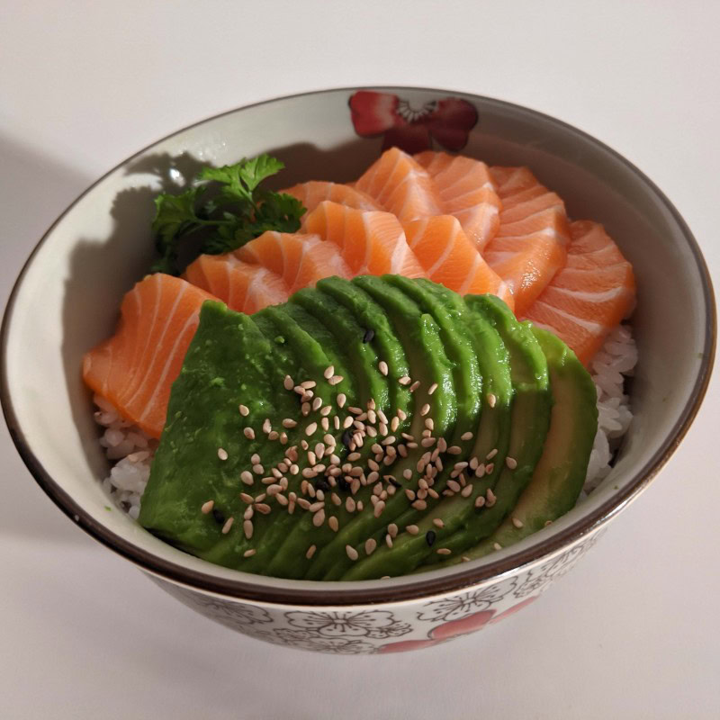 Un bol de riz généreusement garni de saumon frais et d’avocat, pour une bouchée délicieuse et équilibrée.