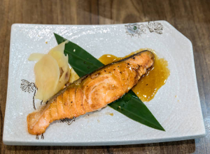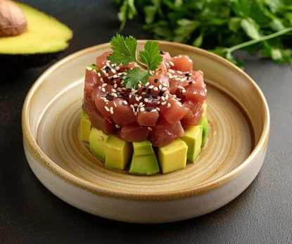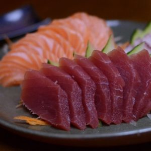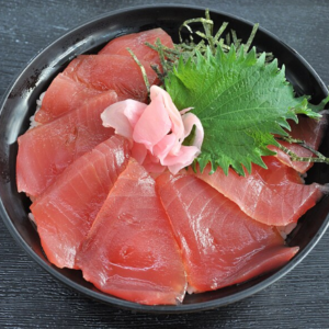 Une soupe miso + un grand bol de riz vinaigré aux tranches de poissons crus et avocat.