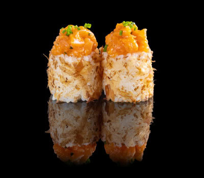 Délicieux Ura Maki au tartare de bar frais, enveloppés de riz vinaigré. (6 pièces)